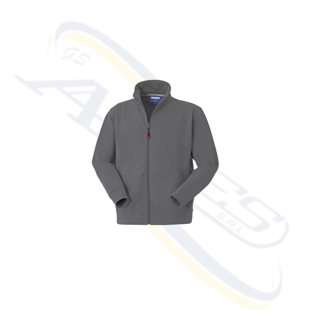 Felpa con chiusura anteriore con cerniera centrale, collo alto, parasudore di colore a contrasto interno al collo, polsi e fascia girovita in maglia elastica, due tasche inferiori a filetto.